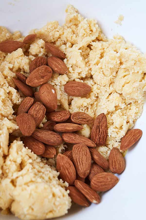 - Vaivaa pehmeä voi taikinaan käsin. Sekoita joukkoon mantelit, jälkiruokaviini ja appelsiininkuori.