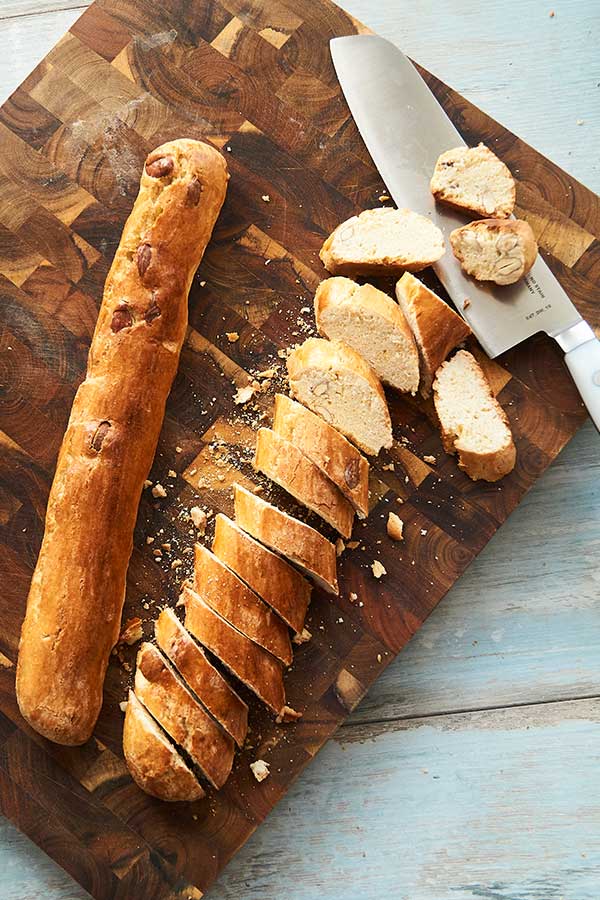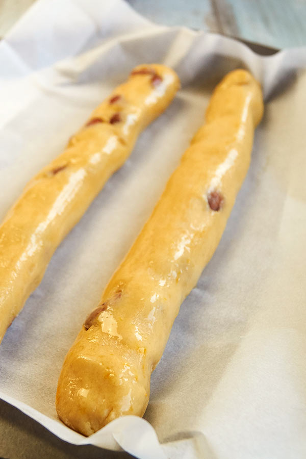 - Poista taikinarullat pelliltä ja leikkaa varovasti noin 1,5 cm leveiksi cantucciniksi.