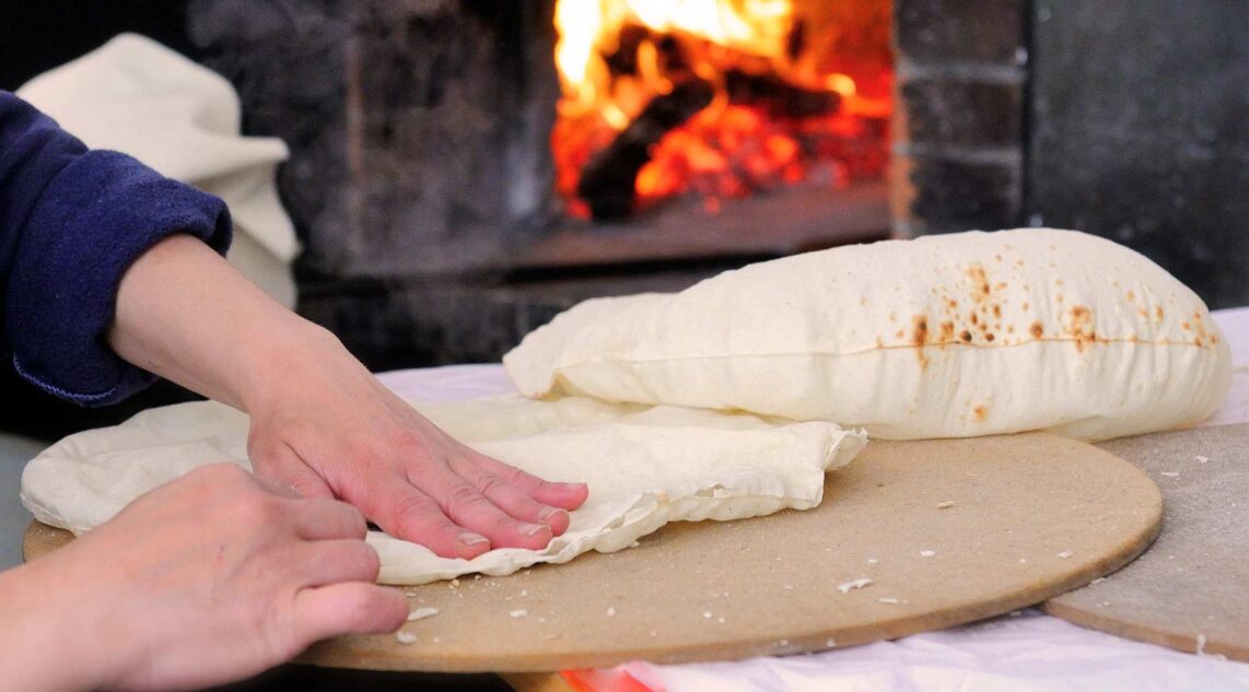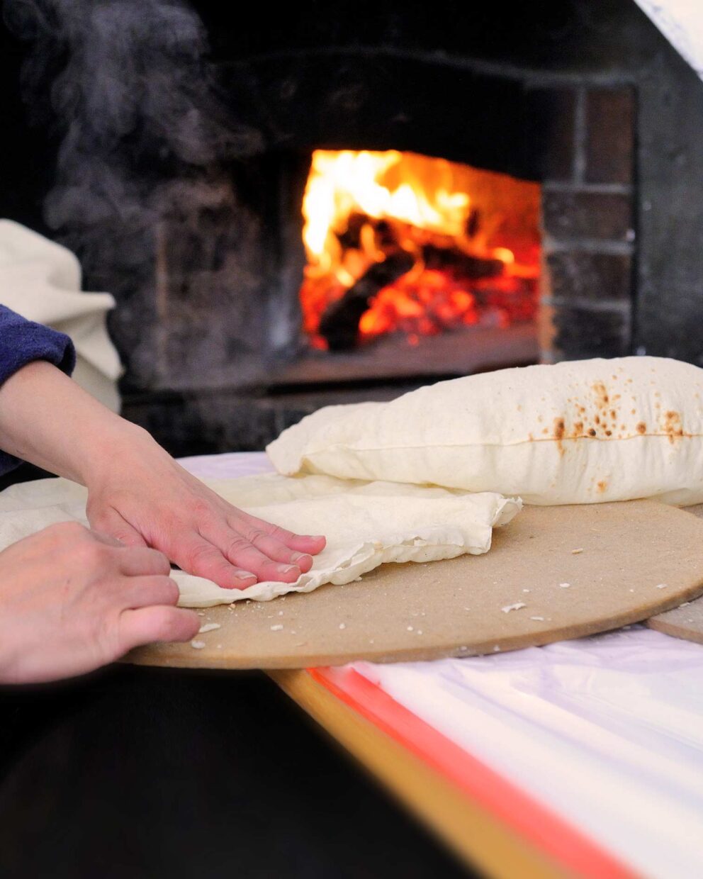 Prosessin seuraava vaihe saa katsojat hämmästymään suu auki. Vain muutaman millimetrin paksuisia litteitä leipiä paistetaan noin 30 sekunnin ajan erittäin kuumassa puu-uunissa suoraan kiven päällä. Sitten tapahtuu taika.